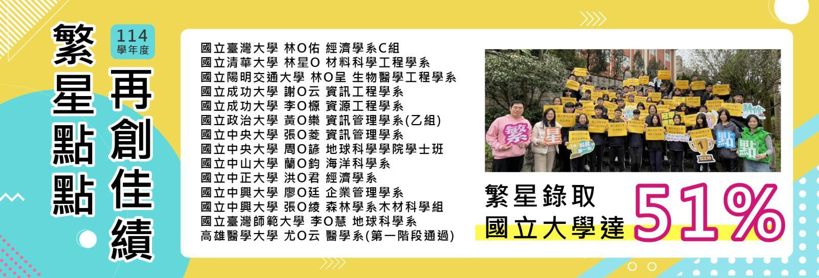 辭修高中114繁星入學再創佳績 頂大全壘打! 錄取46人 國立大學錄取率達51% 傲視新北! 恭喜所有錄取的準大學生們 申請入學再接再厲